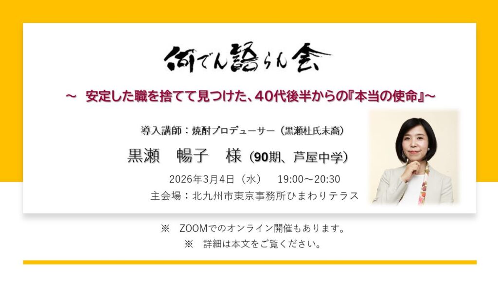 東京東筑会の皆さまのみ参加可能となりますが、同窓のみなさんと、これからについて共に語り合える時間を、心から楽しみにしております。